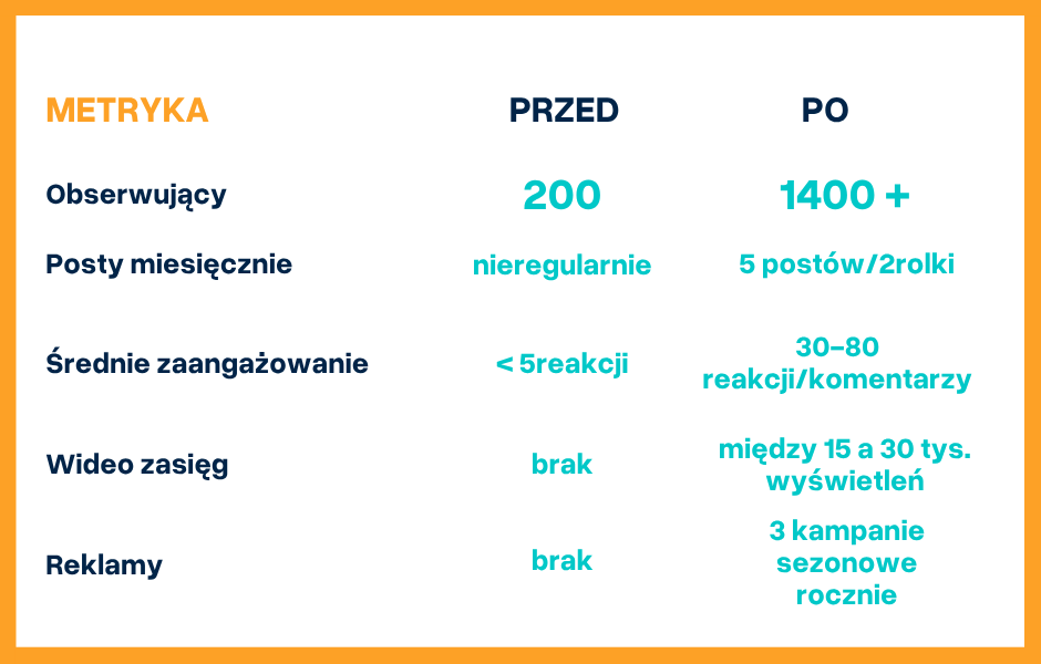 Rozpisanie kompleksowej strategii oraz szczegółowego planu publikacji na profilu przełożyło się na wyraźny wzrost zasięgów organicznych – aż o niemal 30%. Z kolei w przypadku działań płatnych, optymalizacja grup odbiorców oraz praca nad skutecznością kreacji reklamowych pozwoliły na dwukrotne zwiększenie liczby osób, do których docierał content sponsorowany.
