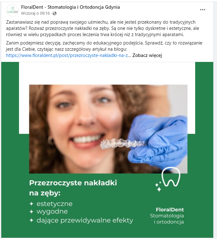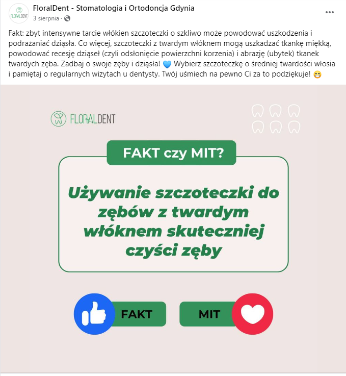 Dodatkowo, za pośrednictwem strony FloralDent na Facebooku, uruchomiliśmy cykl postów edukacyjnych, takich jak „Czy wiesz, że…”, „Fakt czy Mit” czy „ABC stomatologii”, które cieszą się zainteresowaniem wśród dotychczasowych i nowych pacjentów.