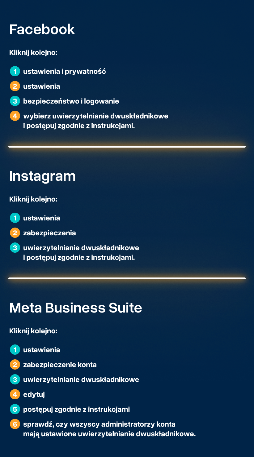 Uwierzytelnianie dwuskładnikowe to dodatkowa warstwa zabezpieczeń. Po wprowadzeniu hasła Facebook wyśle Ci kod weryfikacyjny na telefon lub aplikację autoryzacyjną. Dzięki temu nawet jeśli ktoś zdobędzie Twoje hasło, nie będzie mógł się zalogować bez dostępu do Twojego urządzenia. Będziesz też otrzymywać powiadomienia, gdy ktoś podejmie próbę zalogowania się z nieznanej przeglądarki lub nierozpoznanego urządzenia mobilnego.